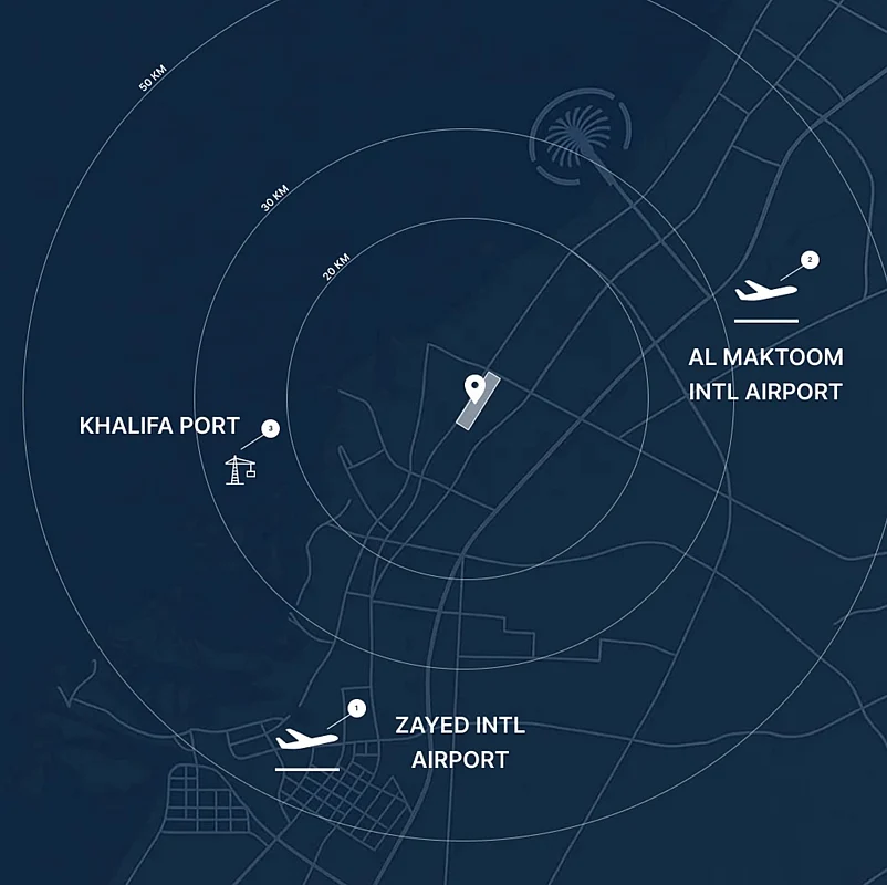 The development’s position between Dubai and Abu Dhabi offers unparalleled accessibility, with both Al Maktoum International Airport and Zayed International Airport within a 50-kilometer radius. This strategic placement along the main highway corridor ensures seamless connectivity to both emirates, making it ideal for professionals, families, and investors seeking convenience and mobility.