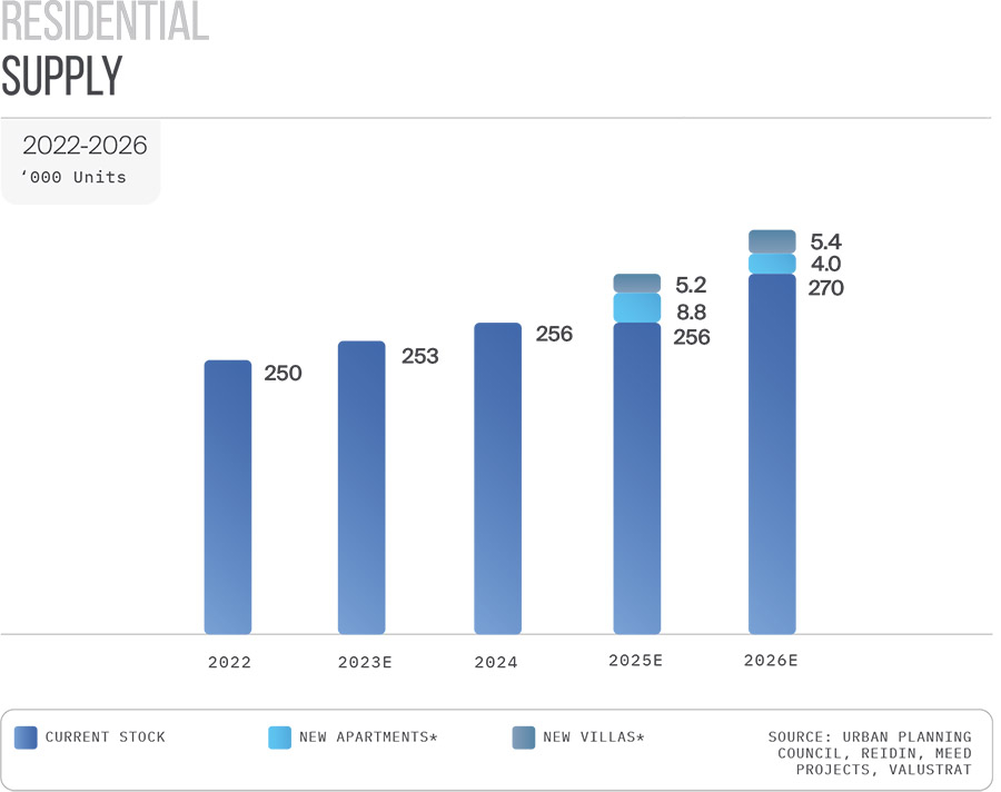 In terms of new housing supply, around 2,400 residential units were delivered in Abu Dhabi city during the first half of 2025. Looking ahead, the supply pipeline is expected to accelerate, with approximately 10,400 units scheduled for completion by the end of 2025, and over 11,000 units projected for 2026.